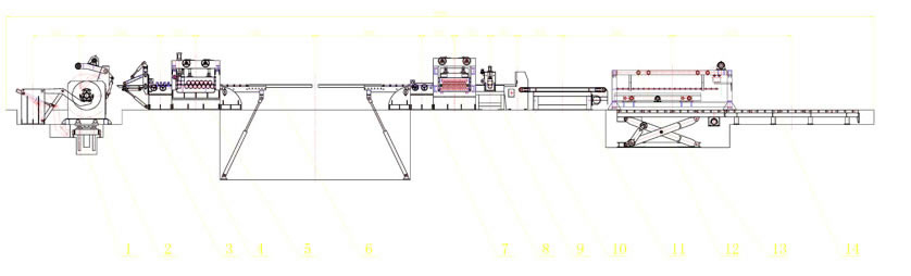 une voiture hydraulique de chargement de la bobine, un support et presseur hydraulique de la tete de la bobine, un premier niveleur 4-HI, quipement de pressage et de pelletage, un rouleau de pincement d'alimentation et une machine de nivelage, un accumulateur de trou, un guide lateral, une machine de nivellement fin et une machine de fixage de la longueur, une machine de tondage mecanique pneumatique, une ceinture de livraison, un tasseau d'empilage, une table d'elevation, un systeme hydraulique et un systeme de controle electrique.