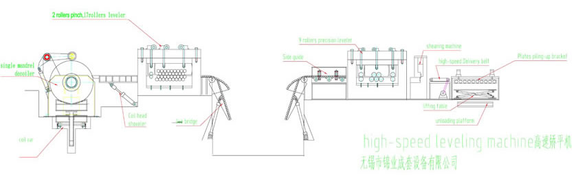 La ligne de coupe a longueur a grande vitesse de la bobine est composee de : une voiture de chargement de la bobine, un derouleur a mandrin unique, un guide de la tete de bobine, un equipement de pressage et de pelletage, un rouleau de pincement d'alimentation et une machine de nivelage, un accumulateur de trou, un guide lateral, une machine de nivellement fin et une machine de fixage de la longueur, une machine de tondage mecanique pneumatique, une ceinture de livraison, un tasseau d'empilage, une table d'elevation, un systeme hydraulique et un systeme de controle electrique.