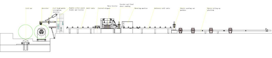 La ligne de coupe a longueur a une machine de pre-nivelage et une machine de nivelage conduite par des moteurs DC ou AC, et le fixage de la longueur est realise par l'encodeur, le tondage est un tondage par arret.